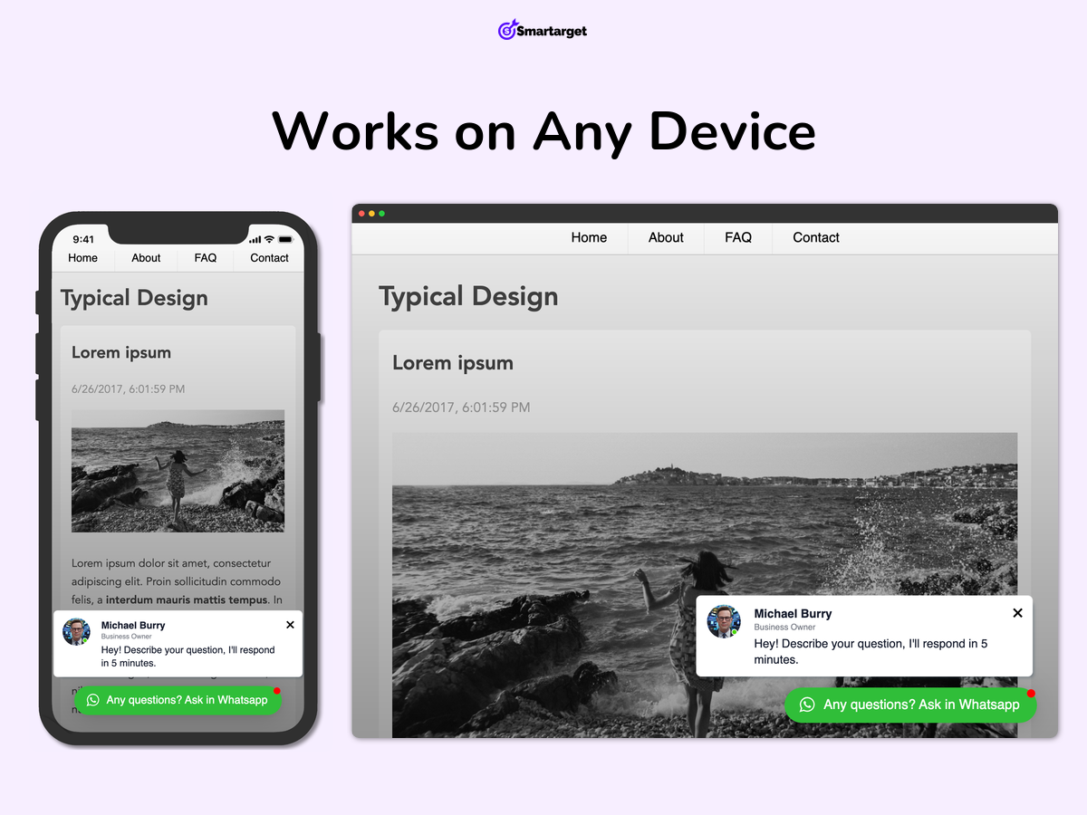 Mit WhatsApp-Support ist es für Kunden viel einfacher, Hilfe zu bekommen, weil sie kein Formular ausfüllen, keine E-Mail-Adresse hinterlassen und keine zusätzlichen persönlichen Daten angeben müssen. Mit Smartarget WhatsApp Chat kannst du mehrere Ansprechpartner anzeigen, und du brauchst keine besondere App zu installieren, weil WhatsApp sowieso schon vorhanden und einsatzbereit ist.